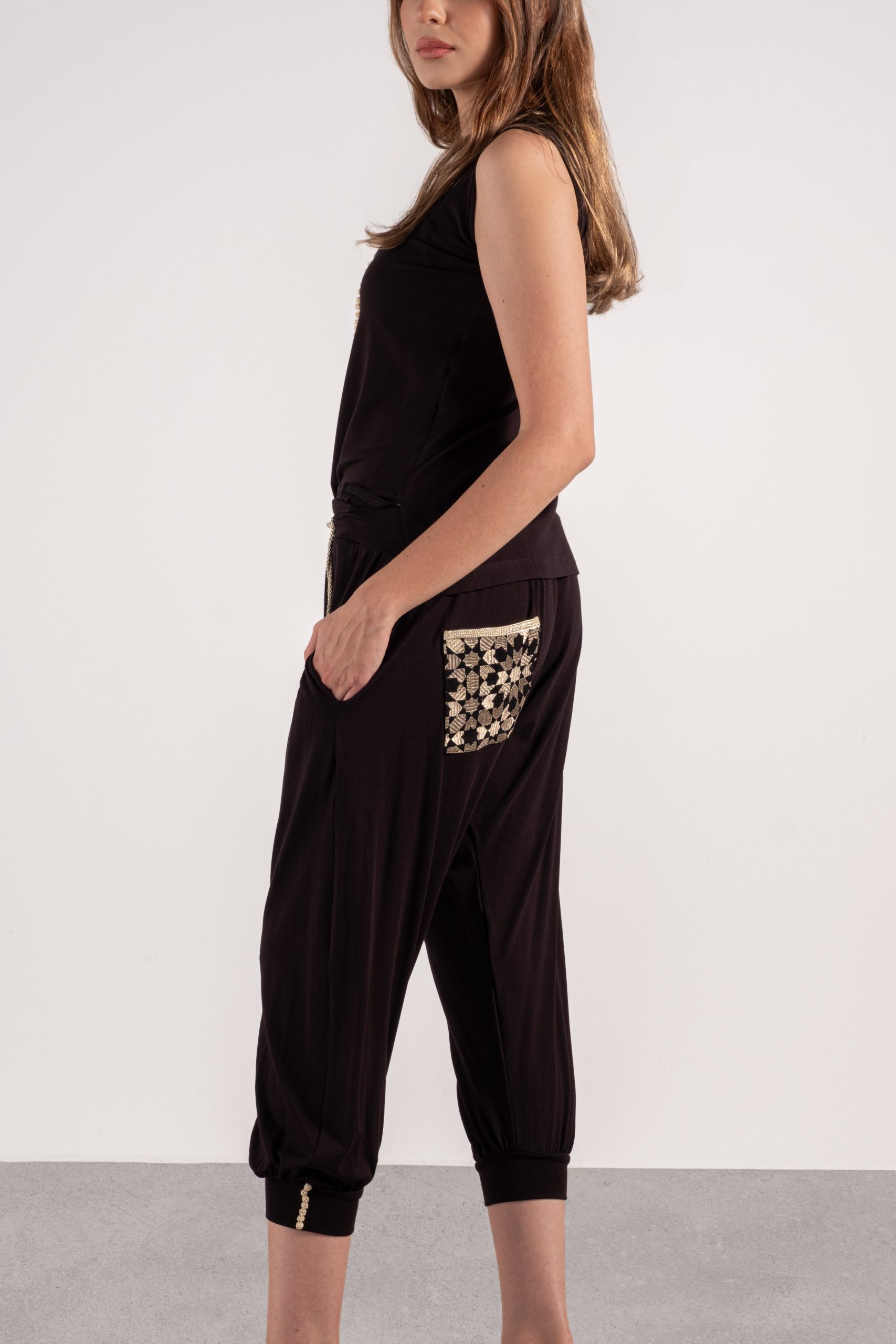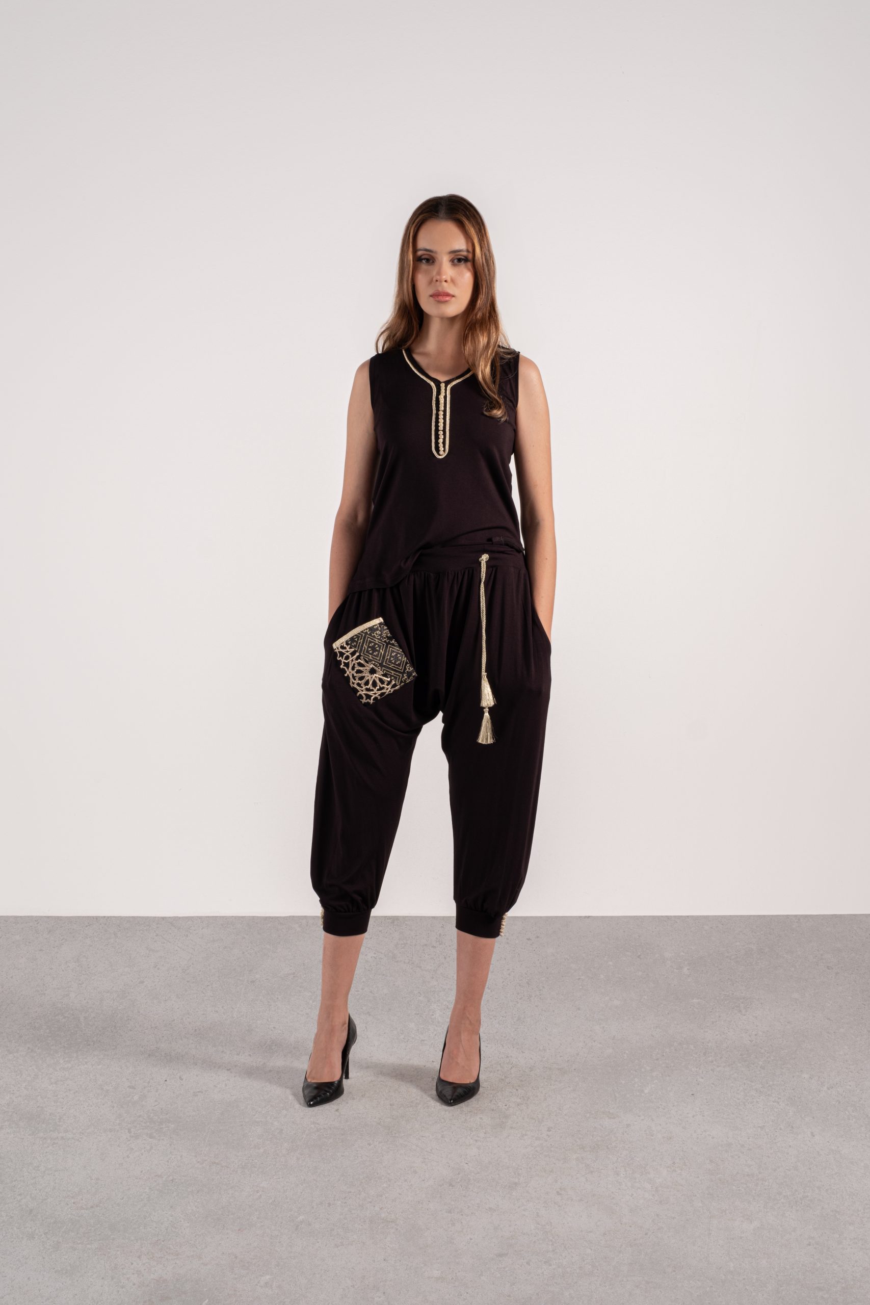 UN LOOK DECONTRACT CHIC AVEC CET ENSEMBLE EN MAILLE COTON. LES EMPIECEMENTS ET LE TRAVAIL DES SFIFAS ET AKADS AVEC DES INSERTIONS DE TISSUS TEL QUE LE BROCARD ET AUTRE LUI CONFERENT UN CARACTERE CHIC ET DECONTRACT.